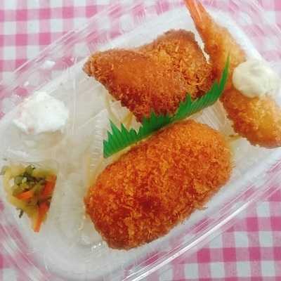 カニクリームコロッケ、チキンカツ、海老フライと揚げ物が3種類入っております。