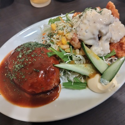 ジューシーな煮込みハンバーグが美味しくビールをすすめます。