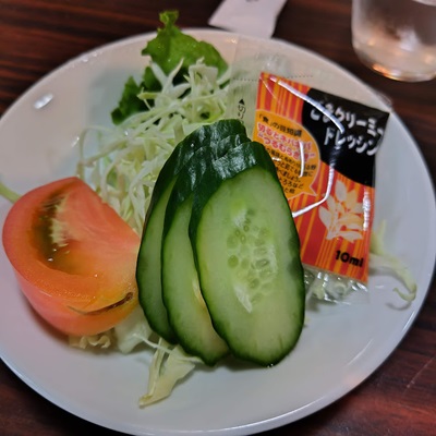 キャベツにレタス、トマトときゅうり、ドレッシングを添えて。