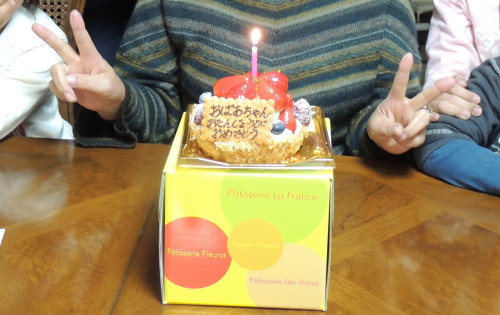 こんにちは~ 雲は多いけどまずまずのお天気で助かっています三が日は如何お過ごしでしたか我が家は全員元気に新年を向かえ、大騒ぎのお正月でしたよ元旦の朝は夫々の家で迎え、夕方に全員集合でしたが何と息子家族4名・娘家族5名・三男とその彼女・娘婿のご両親2名・我が家2名総勢15名での大集合となりました何せ子供5名・大人10名ですからお正月料理のほかに、すき焼き水炊き等々・・・・台所は大騒ぎでした今年もまた 賑やかな年に為りそうです二日目は泊まり組みの6名とご近所探検へ・・・二手に分かれて目的地で集合でしたが、中々現れず・・・をかけると、今道に迷ってると・・・暫くすると現れましたので、良かった鯉に餌をやったり、鳥達に餌をあげたり、せせらぎの小道を歩いたり・・・・途中から子供達と男性は行った事の無い道を行くと言い出しまたまた二手に分かれて帰宅・・・ 帰ってこな~い山道に分け入り、正月そうそう大冒険だったようですそれでも 楽しかった! と今年も ハプニング続きの一年に為りそうそして昨日は、二日早いけどと私の「お誕生会」をと・・・孫の演奏でハッピバースディーを歌って祝ってくれましたこんな時間が幸せなのかな~