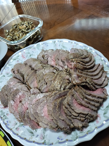 我が家では毎年二日に全員集合で祝います昨年のお正月子供達に「私も80歳になったから来年からはあなた達でお料理をしてね」と申し渡しました今年娘が頑張って作ってくれましたよ~ローストビーフ煮物黒豆ナマスに田作り栗きんとん、全部手作りです私が作ったものはロースとポークとお赤飯と茶碗蒸し買った物は蒲鉾と伊達巻合鴨のロースト2種蟹初めてにしては良く出来ていました皆で美味しく頂きました途中で娘夫婦が結婚25周年、銀婚式だったのでケーキでお祝い午後3時から初めて終わったのは10時・・・最後はゲームで盛り上がってました今日は疲れて一日家でのんびりと過ごしています