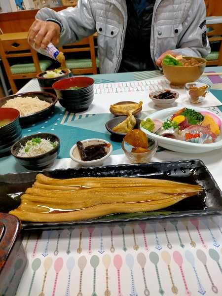 大きなアナゴにお刺身とお味噌汁、小鉢が4個
