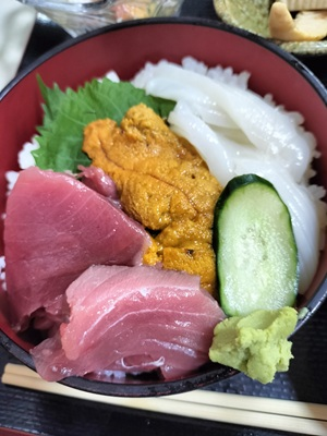 イカと大きなウニとマグロ刺し、このマグロの下には