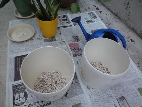 実家から母が来まして2人で鉢とか土とかいろいろ揃え植え替え作業しました。奥の黄色い鉢植えの中身を手前の大きめの白い鉢に植え替えます底にしいてあるのは水はけを良くするためのゴロ石。なるほどな~「これ全部根っこですよ!」匠の手により、家族全員の居住スペースがほとんどない狭く息苦しかった汚い入れ物は取り払われ・・・代わりに太陽の光が燦々と差し込む明るい我が家へと生まれ変わりました。●おしまい●