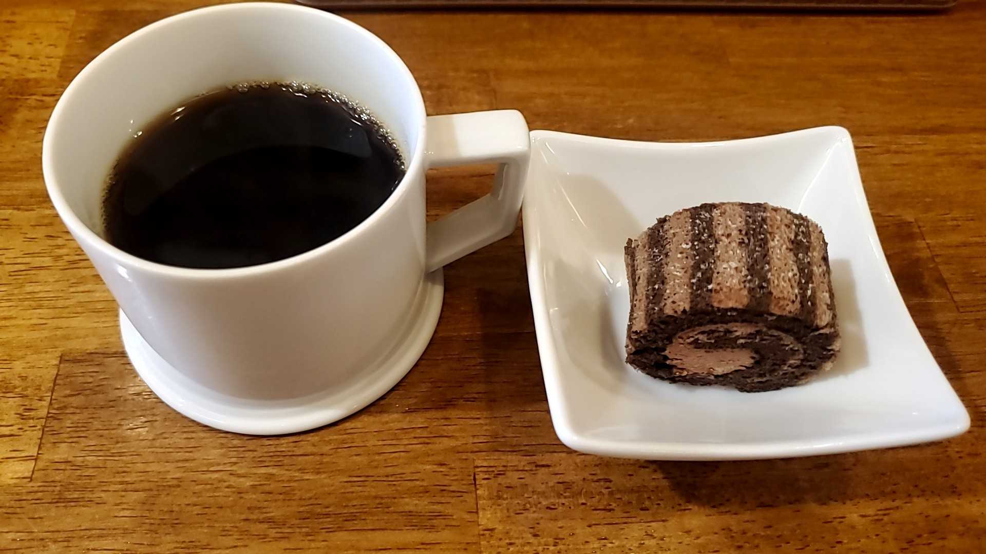 コーヒーうまい。切り株風のロールケーキもかわいい。