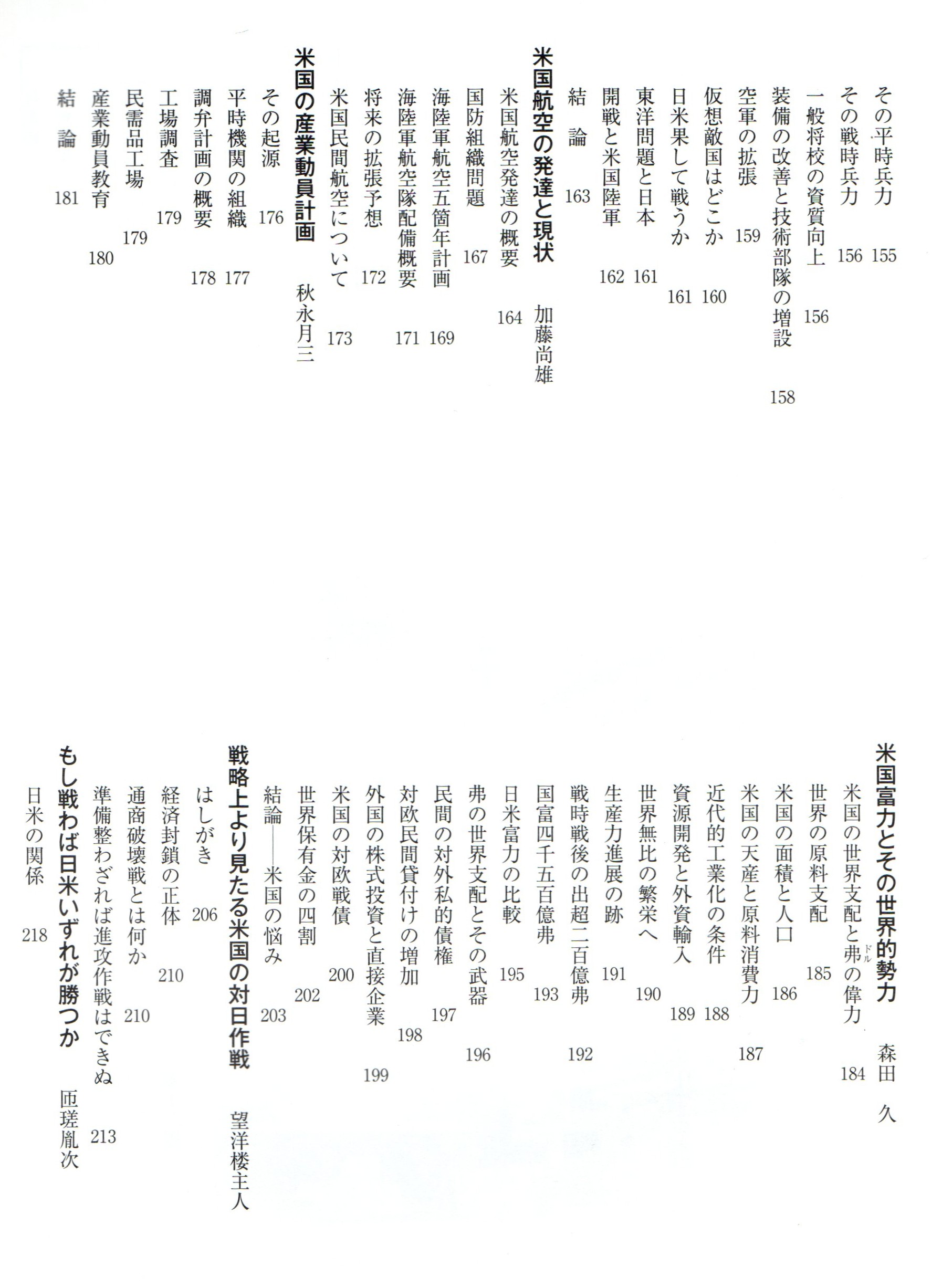 冒頭に「筆者は海軍部内有数の日米作戦の権威であるが、事軍機の秘密に関するので、本誌のため特に匿名で本編を寄せられた。」とある。経済封鎖や通称破壊戦ではうまくいかぬ。海戦をやって日本海軍を壊滅させなければならぬ。壊滅させたところで東京や大阪などへの大規模な空襲をしなければならないが根拠地はフィリピンやグァムだが、受け身に立つ日本には防御す段はいくらもあるから、米国の作戦が思うように進展するか頗る疑問だし、勝ったとしても支那がつけあがるだけなので、米国が慎重になっている。