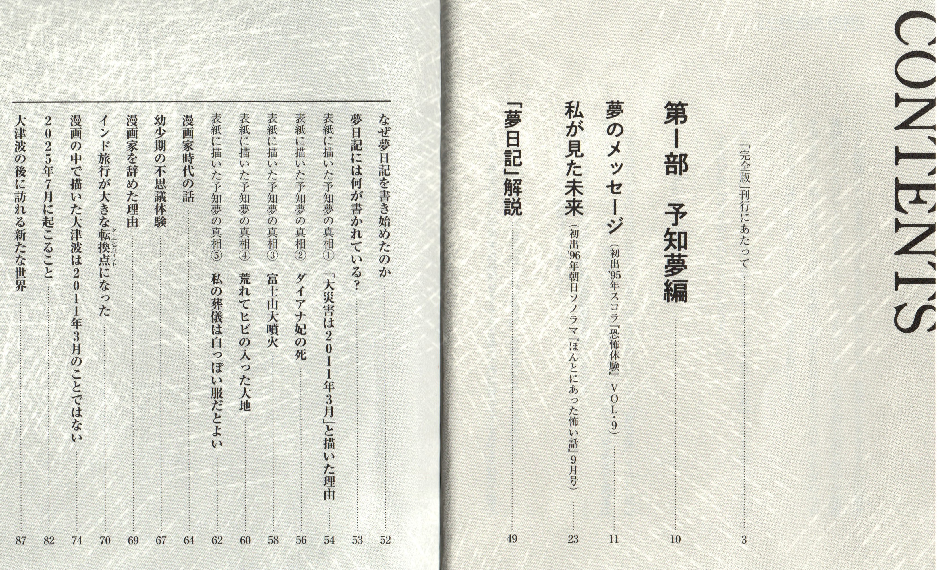 漫画の中で書いた大津波は2011年3月のことではない。著者は津波の夢を10代の頃に見ていた。東日本大震災は冬だったが、夢の大津波の時は半袖姿だった。なので、この後の2025年7月のことだろう。日本とフィリピンの間辺りの海がポコンと膨らんで爆発するような巨大なものだ。津波の高さは東日本大震災の3倍はある。その波の衝撃で香港から台湾フィリピンまでが地続きになってしまう。大津波は大変なのだが、著者には物凄く輝かしい未来が見える。