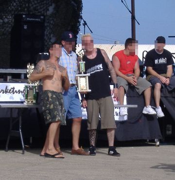 昨日の日記では、Marine Oneなるものを紹介しましたが、その他にこんな車が受賞したみたいです。↓↓ これはMuscle Car部門で1位になった車のようなんですけど、"Muscle Car"がどういうものかが分からない私..... 車のボンネットに見える仮面ライダーの変身ベルトのようなものが、妙に気になってしょうがないコレって、何に使うんだろう?? ライト? それとも拡声器??次はコレ↓ Sedan部門の1位受賞の車なんですけど、私には評価のポイントが全くといっていいほど分かりません~でも、エンジンルームが公開されてるから、きっと手入れされた車なんでしょうね。次にビックリしたのがコレ↓ コレはSUV部門の優勝車らしいんですけど、これまた私、SUVの定義が分からないので、見たままの感想を言うしかないんですけど、この場所にこの車、もったいない~!!!!だって、車で走ったところで、距離なんてたかが知れてるのに、プライベートモニターが設置されてるなんて.....ひょっとしてこれでDVDを見ながら、お買い物??つっても、本編始まる前に、到着しちゃうよ! もしかして、このベースでカーナビゲーション使用???まさかね ヾ(・_・;)とにかく、もったいなぃぃぃ~もし、コレで、次のPCSで、持って行けませんよ~なんて言われたら、涙出ちゃいますよね _| ̄|○そしてミリタリー部門の受賞車は 昨日紹介したMarine One!!と言いたいトコロなんだけど、Marine Oneではなく、その奥に見える黄色と黒でペイントされたBUS(←こういう名前らしいです!) コレ なんでコレがぁぁぁ~???? ただ、トラトラにペイントしただけじゃん!! って思ってたんだけど、実は全然違ってたんですよ!!!!何がスゴカッタって、 内装がスゴカッタカラーで見れないのが残念ちなみに、カウチにセクスィ~の横たえている女性、私たちのサッカーチームのブラウンちゃんです彼女が内装のデザインをしたり、ペイントのお手伝いをしたんだとか。なのに、表彰されたのは↓↓↓↓ ちょっとSteve-Oを思い出させるような、タトゥー大量仕込みのおにいさん。←れっきとした軍人です!カラーで見ると.....↓↓↓ 真ん中の人は受賞者でなく、表彰する側のCOです。多分、この2人が代表でトロフィーを受け取ったんでしょうね。コメントで、「ブラウンちゃんに感謝しま~す」ってお礼言ってましたから。左側の人、最初、乳首摘んでる~???のかと思いましたが、違ってました。さすがにCOを前に、そこまでは出来ないでしょうね。でも、それおもしろかったかも.....と、ここでまた気になるものが!! ↑の写真で、忍者のような靴下を履いてる右側のデッカイ人。腕に変わったタトゥーをしてましてね.....続く!!