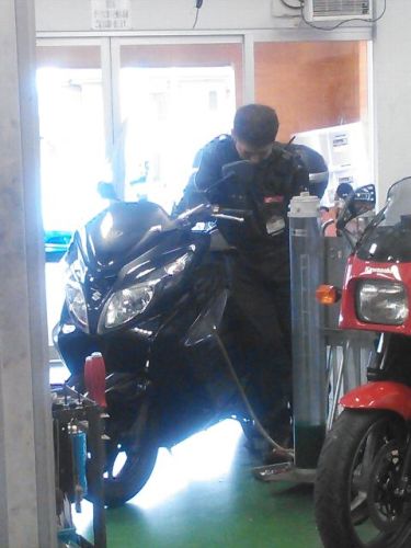 スカイウェイブは主に通勤やら買い物やら日常の足になってます。そりゃ走行距離が増える訳でして。そうするとメンテナンス回数も増える訳です。ふと。クーラント交換だけはした事無いなぁ。面倒なんですよ。カウルにクーラント経路が隠れてるんですもの。NSR50とかTZR50とかならやった事ありまよ。一応バンディット250もやった事あるし。こいつらは経路がむき出しなんですよ。エア抜きもしやすいってもんです。でもスカイウェイブは当然カウルの中なんです。面倒だから業者に投げるか。多少工賃かかりますが、自分が出来ない事をしてもらう技術料なんですから気にしちゃいけません。どこでやってもらおうかなぁと思ってたらライコランド多摩境店にクーラントチェンジャーなる物があるとか。4輪では当たり前に使われてるとか何とか。機械で抜いて機械で入れて。これなら誰の作業でも安心だね早速頼みに行きましたよ。右側のでっかい逆さまの試験管みたいのがソレだそうで。結構汚いですな。ここまで約3万5千km走ってるし、購入直前に交換してくれたという言葉を信じるにしてもそれでも1万3千km以上は走ってるし。まぁ、これで一安心にですかね。