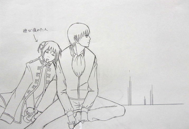 こんにちばんわ。林です。今日は、「一人で好きなことをやることの寂しさ」について考えていました。いやいや、皮肉とかではなく。私は一人で散歩したり、自家用車や公共交通機関を使って一人旅したりするのが好きなのですが、最近ふと、「この時間、自分が今考えてることとか、思っていることを誰かと共有できたらな。」って思うことが増えまして。でも、これがまたわがままなところで、誰かといるとすぐに「早く一人になりたいな。」とか、「一人でやったら楽しいのにな。」とか思っちゃうのですよ。でもでも、自分の周りの身近な誰かには、自分がここに存在していることを知ってもらいたい。自分がここにいた証を持っててもらいたい。・・・なんだか林の心は度を越してフクザツです。街路樹の落葉に秋を感じたからかしら。もしかしたらみんな、そんな風に微妙な心の動きを、常に持っているのかもしれない。だから、TwitterとかFacebookとかブログとかで、「私はとりあえずここにいますよ。」ってことを伝えているのかもしれない。しょっぱなから重いゾっ☆ということで、イラストUPします~久しぶりに銀魂イラ。今週から地味にCP祭りを開催していきたいと思います。まずは第一弾、沖神で「休日の午後、二人と一人の憂愁。」↑クリックしたら、ちょっとだけ拡大するよ↑永遠の14歳と18歳。羨ましすぎるわ。絵を描いた時のイメージとしては、午前中はトムとジェリー的な、「なっかっよっくケンカしな♪」的な時間を過ごした午後、ヒロインの方は隣ですやすや・・・ヒーローの方は、二人でいること(隣に神楽がいること)の安堵感を感じつつも、もしかしたらこの安心は続かないのではないかという不安を一人で感じてるっていう・・・黄昏時をイメージして、影とか付けて、セピア色とかにしたら、それっぽくなるような気がする。さて、神楽はどうやって総悟君の上着を奪ったのでしょう?(笑)そういえば、実写版銀魂は、堂本剛さんが高杉さん役ということで。どう演じるのか楽しみですね。ただ、私の中で高杉さんは病的に痩せてるイメージがあるので、そんなイメージを感じれたらいいな、とかなんとなく思ってます。次回もなんか銀魂CPなイラストをUPします。それでは~====================