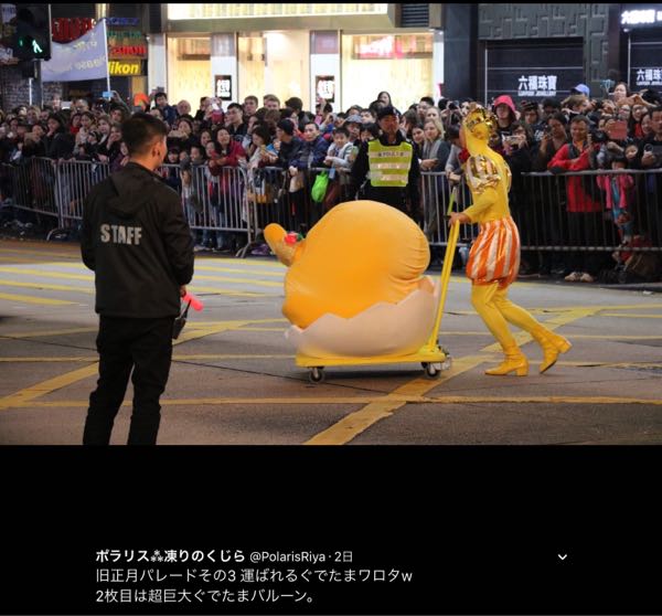 ぐでたまが、香港の旧正月のパレードに参加したそうです香港にお住いのポラリス⁂凍りのくじら様から情報とお写真の提供をいただきましたありがとうございましたニセたまさんに運んでもらったんですね~バルーンでも登場 手をあげててかわゆしキティちゃんとダニエル君はミラクルギフトパレードの衣装かなパレードの観客の多さにびっくり盛り上がりが伝わってくるお写真に感謝これからも、香港のぐでたま情報を送ってくださるそうです。楽しみですTwitterでもつぶやき中です➡@gudeugde_mamaランキングに参加しています。クリックお願いしますにほんブログ村人気ブログランキングへ