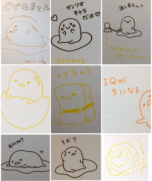 6月26日~7月2日に西武池袋本店(東京)で開催されたぐでたま展の紹介です行かれなかった方には雰囲気が伝われば…行かれた方には 懐かしく思い出していただければと思います(n*´ω`*n)会場には、パネルや映像の「展示」以外にも、Amy先生が直接 開場で描かれた『落書き』がたくさんあって、それを探すのも一つの楽しみでした全部 探しきれたのかな・・・どなたか 答え合わせをおねがいします(笑)Amy先生のファンが喜ぶようにと描いてくださった た~くさんの『落書き』を一挙公開フォトスポットのパネルの裏に描かれたいたずら心満載のイラストどれがどのフォトスポットにあったかは・・・前記事と見比べて想像してみてくださいねいいねのクリックをしていただけると嬉しいですにほんブログ村人気ブログランキング最新情報はツイッターでつぶやいています ぜひそちらもフォローお願いします