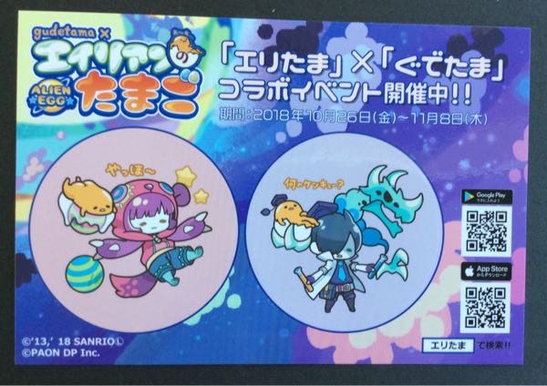本格エイリアン育成RPG「エイリアンのたまご」でぐでたまコラボキャンペーンが開催ですこれはまさに「たまごつながり」ゲーム内ではぐでたま化した人気キャラクターがコラボガチャに登場ゲットしたコラボ限定キャラたちは11月2日から開催される「ぐでたまカップ」で活躍するそうですよ【ぐでたまかふぇ来店でコラボ記念ステッカープレゼント】実施店舗:大阪梅田HPE FIVE店/千葉そごうJUNNE店実施期間:10月26日~11月8日☆数量限定のため無くなり次第終了【追記】お友だちが千葉そごうまで行ってお迎えしてきてくれましたありがたや~~いいねのクリックをしていただけると嬉しいですにほんブログ村人気ブログランキング最新情報はツイッターでつぶやいています ぜひそちらもフォローお願いします