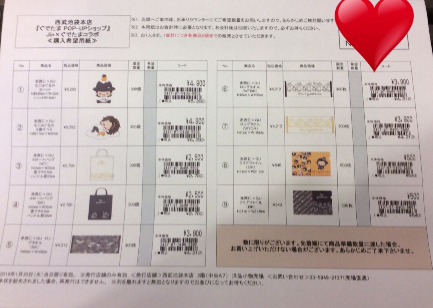 2019年1月30日~2月14日まで 西武池袋本店2階特設会場にて ぐでたまPOP UPショップ開催今回は話題沸騰中の赤西仁さんとのコラボグッズ「Jin×gudetama」商品が先行販売ノベルティもあるので早めにGo先行販売される Jin×gudetama商品リストオープン初日 開店前に配布された整理番号つきの商品リスト(兼注文書)商品のサイズ・値段が記載されてますので ご参考にどうぞコラボグッズに関しては、1商品につき一人5個までの個数制限がありますまず、ピッキングカウンターで7スタッフに希望商品・希望個数を伝えると、注文書に記入&買い物袋に封入してくださり、レジに移動して支払うというシステムでした(1月30日現在)商品をむやみに触られることなく きれいな状態のものを購入できるので好感が持てました【店舗風景】コラボグッズぐでたま5周年グッズ(ぬいぐるみは除く)ぐでたまグッズ(西武鉄道コラボ、リーメント、たまごっち、お菓子など)5周年グッズとぬいぐるみガチャもありました(一人3回までの制限つき)イベント限定販売の洋食屋さんシリーズいいねのクリックをしていただけると嬉しいですにほんブログ村人気ブログランキング最新の情報はツイッターでつぶやいています。ブログは事後報告で、イベント等は終了してることも多いので、ぜひTwitterのフォローをお願いします ⇒ https://twitter.com/gudegude_mama