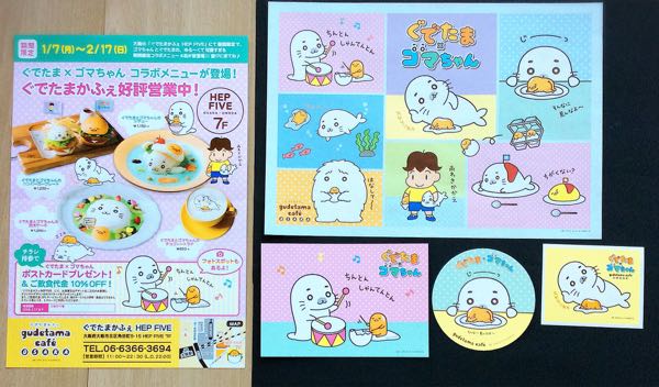 大阪梅田のHEP FIVEにあるぐでたまかふぇでは、1月7日~2月17日までの期間限定でゴマちゃんとのコラボメニューが登場しています母がノベルティをもらってきてくれましたほぼ、レギュラーとして店員さんにも顔見知りになっているらしいありがたいことです一式がこちらランチョンマット アップその他アップポストカードはウラもかわゆしお友だちがぐでたまカフェで撮った写真を送ってくれましたぐでたまがコースターを抱っこしてるみたいでかわゆしサンリオキャラクターとのコラボのときには、サンリオショップで買い物をするとコラボデザインの限定缶バッチがプレゼントされましたが、今回はノーマルなメモ帳(100均でも販売)期待してたので ザンネンですいいねのクリックをしていただけると嬉しいですにほんブログ村人気ブログランキング最新情報はツイッターでつぶやいています ぜひそちらもフォローお願いします