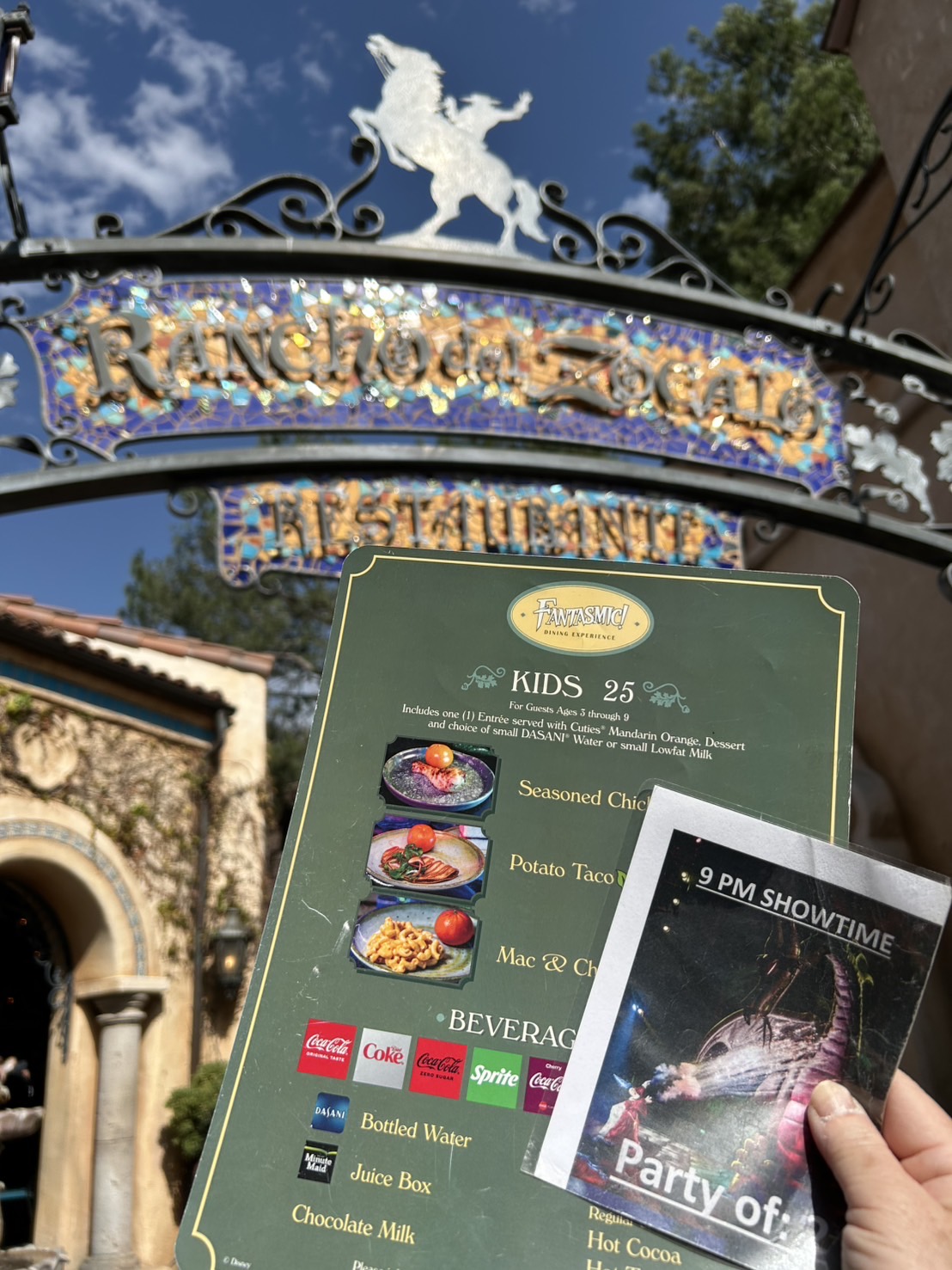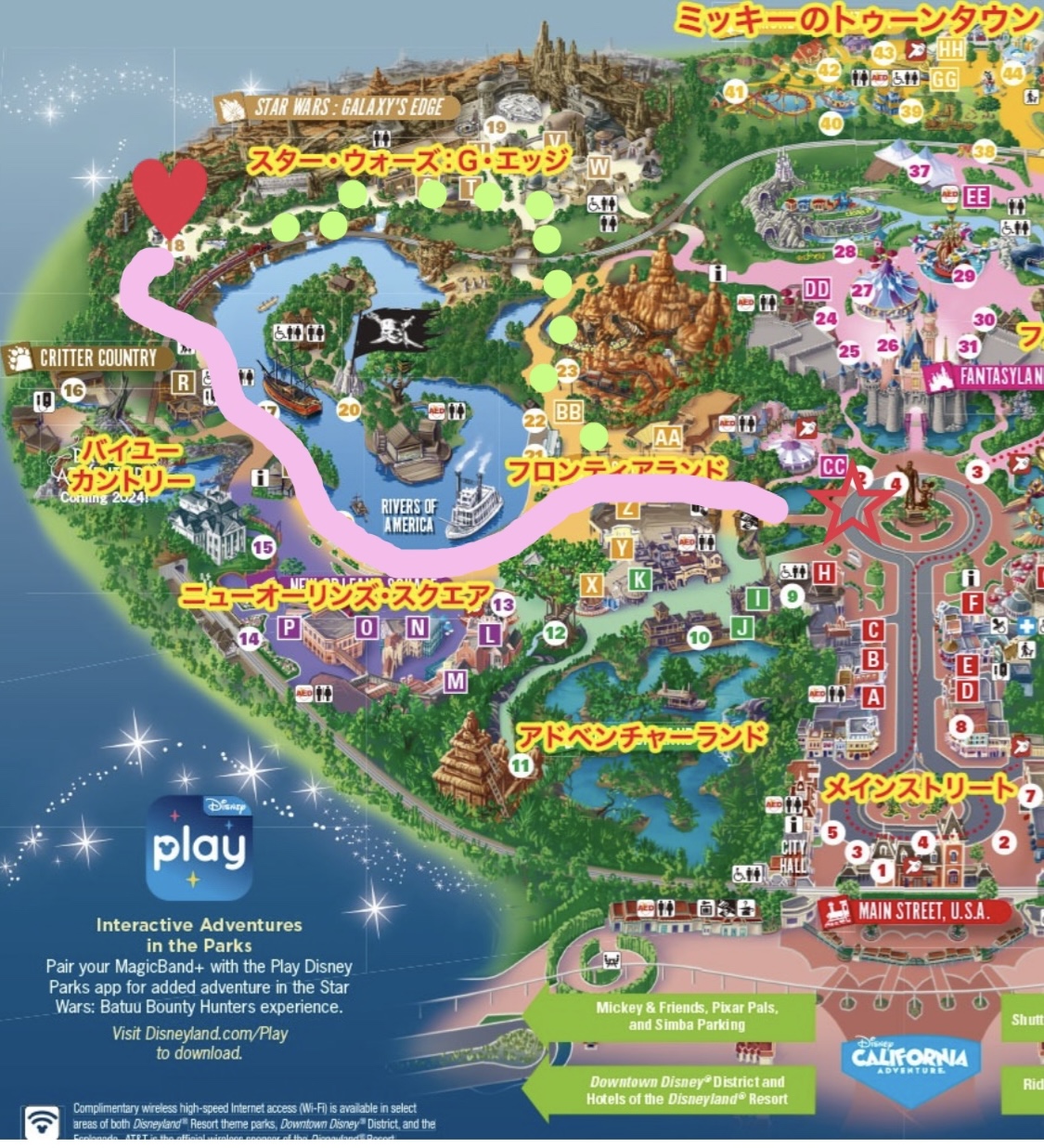 母娘ともにディズニーのキャラクター推しではなく、グリーティングには全く興味がないのですが、ショーを観るのは大好き❣️なので、ディズニーランドの夜のショー「Fantasmic」を観るのが旅の目的の一つでした「Fantasmic Dining Packages」というレストランとFantasmicの観覧席が確保されたパックがあることを知り、迷わず予約することにしました❗️3つのレストランで4種類のパックがありましたが、食事に時間をかけたくなかったのと、一番値段が手頃だったのでRancho del Zocaloに決定‼️ショーの時刻も選んで予約できるし確約なので、良い席で観たい人にはオススメです✨️予約は60日前からでドキドキしましたが、全く問題なく予約ができました👌一番困ったのは、レストランの予約時刻早い時間帯は、入園者も少ないはずなのでアトラクションを攻めたいから、できれば遅いほうがいい。でも、パレードも観たい。でも、60 日前はまだパレードの時刻は発表されてない(でも、きっと午後の早めに時間帯)これが一番迷ったことかも⁉️当日はレストランの入口のスタッフに予約画面を見せると、メニューとショーのチケット交換カードがもらえます(kidsメニューで撮影してました💦)メニューリストはかなり使い込まれていたので、ずっと同じメニューのようです店内に進むと立札がありますこちらの専用のレーンに並んで注文すると、目の前で盛り付けてトレーで渡されます⇒ドリンクコーナーで好きな飲み物を好きな量、セルフでとります⇒会計時にショーの入場券を人数分渡されますステーキが柔らかくてめちゃくちゃおいしかった😋エビのタコスは辛めですが、エビがプリっプリ🍤コーンはすっぱくて苦手で残しましたが、それでも満腹になりましたパレードはとても小規模でしたが、待ち時間もなく、キャラクター達が超至近距離まで来てくれるので(撮影してる間がないぐらい) 楽しめました😊ドナルドとデイジーが車の中でKissしたりいちゃいちゃしてましたよ💕7時40分頃、受付近くに行くと、整列はしてないものの待っている風な人たちがいました(地図☆)3人のスタッフが立っているので尋ねたら「時間が来たら、自分たちが案内する」とだけ教えてくれて、どこに並べばいいかはわからず💦Rancho del Zocaloの利用客の観覧席がステージに向かって左サイドと聞いていたので、とりあえず左側に寄りつつ「スタッフの近く」で待機(←これ、重要☝️)20時頃、待機列を作る場所(地図♡)に移動開始するのですが、ここに並んだ順に席に案内されるので、スタッフの近くにいた私達はほぼ最前✨️レストランごとに案内開始(ここで並んだ順番に整然と1列で誘導される)され観覧席ゾーンに案内されたところで、チケットを渡し、決められたゾーンの中なら好きな場所に座ることができました‼️というわけで、ステージ(地図○)正面を確保❣️びっくりするぐらい良い場所だったので、このパッケージを予約した自分たちをほめちゃいました😆動画はYouTubeに。映像と音楽の素晴らしさは写真では伝えきれません船に乗ったキャラクター達が登場❣️めっちゃ いる😍そして、このパックを利用するなら、1回目のショーがだんぜんオススメ‼️池で座って観覧するので夜がふけるほど底冷えしてしまうという理由もありますがなにより、ショーが終わったあとすぐに花火が始まるので、最前のめちゃくちゃ良い場所から、そのまま花火まで観ることができるからです✨️約10分間、花火と噴水に映し出されるを楽しめます💕花火に興味がないのか、知らないのか、Fantasmicが終わると移動してしまう人もいるし、知ってる人がわ〜っと前に来るので、ざわつきますが、落ち着いてそのまま待っていることが大事⚠️ディズニーランドは24時まで営業しているので、花火のあとも まだまだアトラクションやお買い物をゆっくり楽しむことができました💕