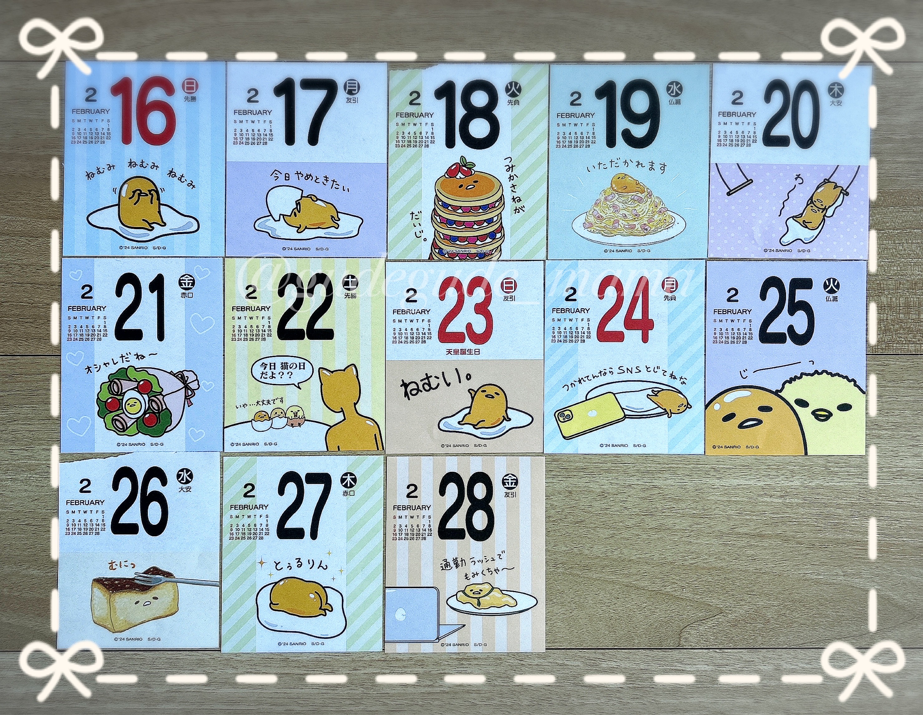ぐでたま 日めくりカレンダー 2月後半事情があって、月末より少し早くアップしますサンリオ(SANRIO) 日めくりウォールカレンダー 2025年 ぐでたま 壁掛 451487ランキングに参加しています。アイコンをクリックしていただけるとうれしいですにほんブログ村人気ブログランキング最新の情報はX(旧ツイッター)でつぶやいています。ブログは事後報告で、イベント等は終了してることも多いので、ぜひフォローをお願いします ⇒ https://twitter.com/gudegude_mamaInstagramもやってます→https://www.instagram.com/gudegudemama2016/