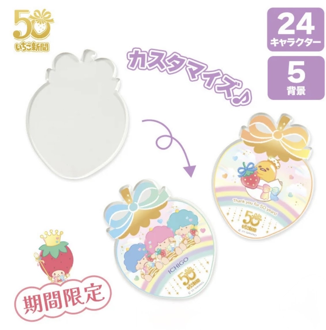 サンリオオンラインショップ本店限定のカスタマイズサービス「MY SANRIO 」で、期間限定(~2025年12月31日)で「いちご新聞50周年記念シリーズ」が登場❣️キャラクターはもちろんのこと、背景や文字を自分でカスタマイズして、世界に一つの推しグッズを作ることができます‼️【アクリルネームバッジ】1980円(税込)【多機能トートバッグ】4290円(税込)ぐでたまでイメージしてみました😉ネームバッジとトートバッグでデザインが違うのが粋✨️ランキングに参加しています。アイコンをクリックしていただけるとうれしいですにほんブログ村人気ブログランキング最新の情報はX(旧ツイッター)でつぶやいています。ブログは事後報告で、イベント等は終了してることも多いので、ぜひフォローをお願いします ⇒ https://twitter.com/gudegude_mamaInstagramもやってます→https://www.instagram.com/gudegudemama2016/