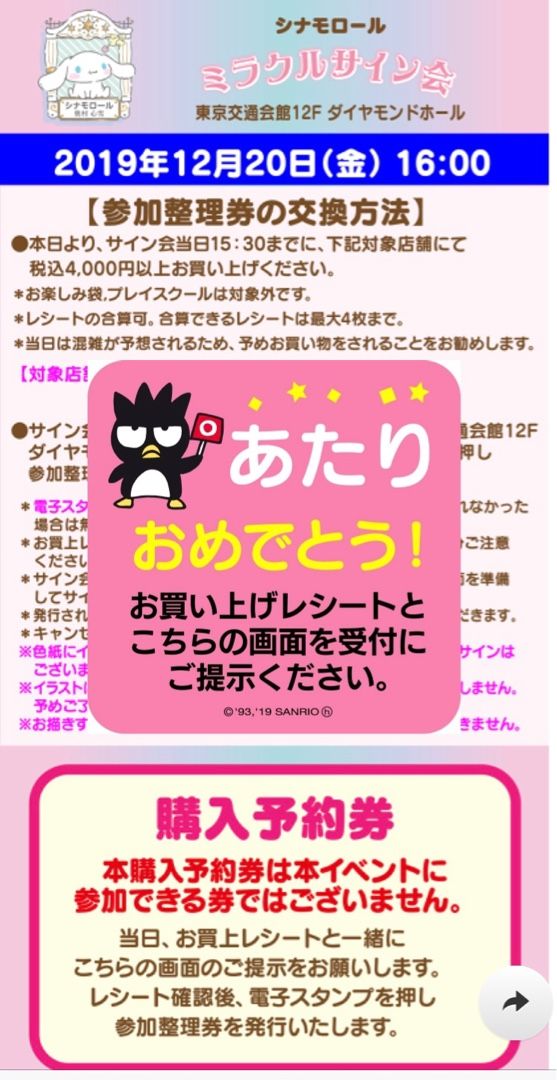 銀座サンリオギフトゲート2階に各キャラクターごとのQRコードを読み取ると、スクラッチ画面が出て、その場で当たり・はずれがわかる方法でした