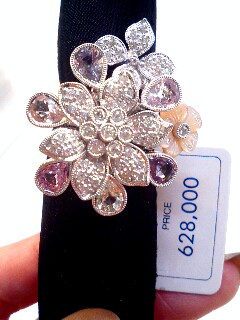 ドロップ型の枠の中の少しカラーの入ったものがサファイヤです。他の部分はダイヤ。花形のピンクがシェル使用。