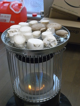 さすがにストーブに火をつけた。お湯をわかすだけでは脳が無いので芋を焼いているのだが、秋口には投げ売り状態だったのに、食べたい季節になると高くなってる。。いっこ298円。。。アホかと。無人販売所で100円で仕入れることとする。 芋を焼くだけでは脳が無いので、 エリンギを乾燥させてみる。エリンギを輪切りにし焼き網に乗せてストーブの上。輪切りエリンギはカレーに入れるとなんとなく貝柱っぽいんだけど、若干歯ごたえが弱いのと風味がキノコ臭いのが難点。含んでいる水分がキノコ臭さの原因に違いないので、乾燥させれば臭みが消えるはず。ついでに歯ごたえも増すはず。で、乾燥後。 大きさが4分の1ぐらいに縮んだ。更に乾燥を進めるとストーブの熱で香ばしくなってくる。なんとなんと、香ばしいアタリメの臭がしてくるよ!食感だけでなく匂いまでもが海産物チックになるなんて。イカスぜエリンギ!! けど、食感は干ししいたけの軸っぽくなっちゃった。。