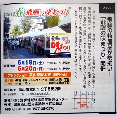 高山祭りのようなメジャーイベントではありません。春と秋、毎年やってます。地元民向けのイベントなので混まないのが快適だよ。とりあえず、飛騨近辺の食いもんが集まっるので、チマチマと買い集めて、持ち寄って、酒の肴にするのがよろしいね。てか、健康な頃はしてたな。これから高山はミニイベントだらけになります。そんな日にお越しの方がメジャーな日より、随分と楽しめると思うのでお勧めですよ。
