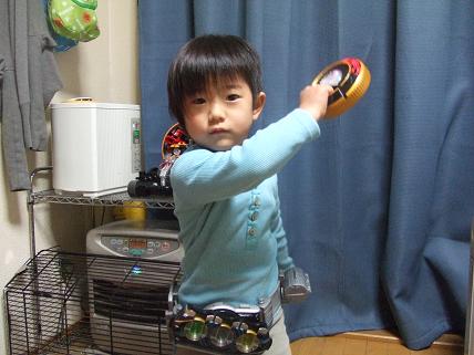 保育園から帰ってきた虹也のするコトは仮面ライダーオーズに変身することです変身ポーズも完璧これでパパがいれば戦いごっこの始まりです帰ってきてから寝るまで仮面ライダーで遊んでてよくあきないなぁ