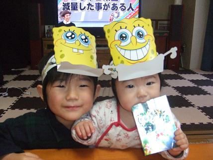 マックでハッピーセットをたのんだらもらえましたなぜか2つも仲良く二人で付けてる姿が可愛かったのでパチリしました叶羽はすぐに取っちゃいましたけど虹也はお気に入りなのか今日一日ほとんど付けてます今もつけたままポニョを真剣に見てるもう何回見てるかなぁ私はつまらない