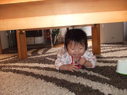 机の下で遊んでいた叶羽を呼んでみました「おいで~一緒に遊ぼう」こっちにきずいてにっこり笑顔だんだん近づいてきたよ だいぶ腹ばいで動けるようになったから早くハイハイできるとイイねん