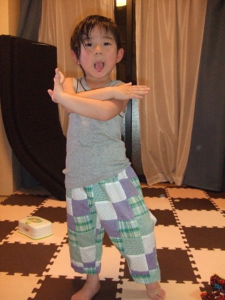 虹也にパンツを作ってあげたのですがちょっとパジャマっぽい気がするのですが110サイズで作ったのですが大きいかなぁ次はがんばるよなっくん
