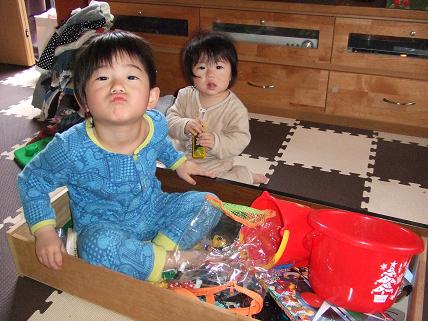 そろそろ暖かくなってきたので子供達の洋服の整理をしていたのですがたんすの引き出しがいつの間にか遊び場になっていましたこんなにおもちゃを詰め込んで・・・片付かないから返してくださ~い
