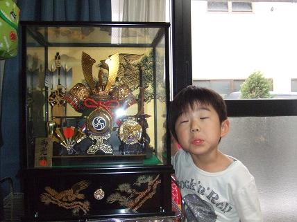 ちょっと遅くなったけど兜を出しました虹也は大喜びでずっと兜の前でちょろちょろしてました「ママ写真撮って」と言われ撮ったのですがこの表情ですもうちょっとマシな顔をしてほしい