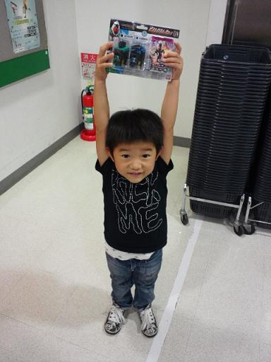 本日発売の仮面ライダーフォーゼのアストロスイッチが買えましたうちの近くの西友で朝9時から抽選券を配るとゆうので朝一で行きました虹也の番号は「8番」当選発表は2時からでしたドキドキしながら番号を見に行くとなっなんと番号はありませんでしたがっかりしてしょうがないからフォーゼの本を買ってあげようと思って本屋さんに行くと後ろから「すみません」と声をかけられましたなんだろうと思って振り向くと子連れのパパでした「実は引換券を2枚持っていてよかったらどうぞ」と思いもよらないコトを言ってきてくれました。なんとそのパパは2枚とも当たっていたみたいでしたお言葉に甘えて引換券をいただきました券を持ってアストロスイッチを買うと虹也は家に帰るまで ニコニコしながら眺めていましたよ 券をくれたパパありがとうございました虹也は楽しそうにあそんでいます