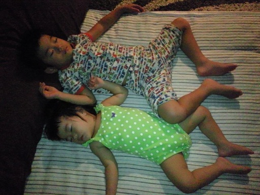 なんだかいつも同じ格好で寝ている気がしますあまりにもかわいかったのでパチリしました寝ているときは静かで天使のようなのに起きていると二人で大声で叫んだり、けんかしたり元気なことはイイ事だけども・・・