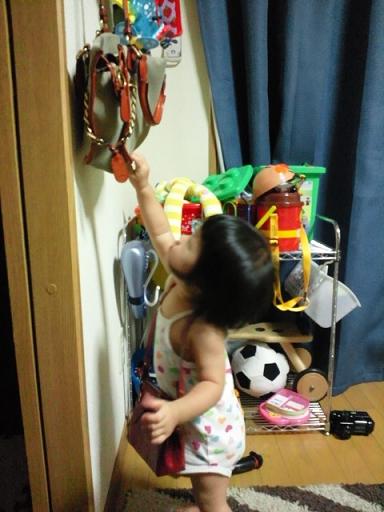 外に行く時にはバッグを持っていくのですが家の中でも持っていますいつもバッグをかけてあるところに行き「取ってよ」とアピール取ってあげたのですが今日はママのがよかったみたい「叶羽のバッグかわいいでしょ」