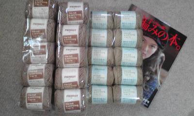 今日、100円福袋が届きました。いっしょにたのんだのはこちら、 ベーシックコットン 7番 20玉さらっとUV 6番 10玉後ろは「手編みの本」vol.8、届いたのでいっしょに。 似たような色ですねー。原色が好きなんですが、無難な色というとこういうのをえらんでしまいます。白っぽいものより濃い目のベージュとか薄茶とか。 で、みなさんが気になる100円福袋の中身がこちら。右からベーシックコットン 4番 黒 5玉 ふんわりキッズ 1番 2玉ロングファー 9801番 白 1玉Material「素材そのまま」シリーズ EG701 1本ラミー100 11番 2玉ソフトメリノ 9番 赤 2玉たぶん クリスタルブークレー ピンク 1かせ 定価で計算したら・・・6000円以上!満足満足謎のかせ糸以外は、みんな買い足しがききます。在庫があるうちに買い足しておこうかなって・・・ダメダメ危ない危ない、また在庫を増やしてしまうところでしたよ で、全12玉 1個 1かせこれで100円!お得ですよね。何編もうかな。 毛糸家計簿毛糸をポチしなかった日 6日 今日の消費は 0玉今年の消費は 249玉 今日の毛糸購入は 44玉 今年の毛糸購入は 497玉 在庫は 1321玉になりました。 今年の完成品は セーター(長袖) 1枚 セーター(半袖) 3枚 チュニック 3枚 ベスト 1枚 カーディガン 2枚 ジャケット 3枚 スヌード 4本 ネックウォーマー 1枚 ストール 1本 マフラー 7本 ショール 4枚 ラリエット 1つ 帽子 1個 手袋 1双 靴下 2足 バッグ 1個