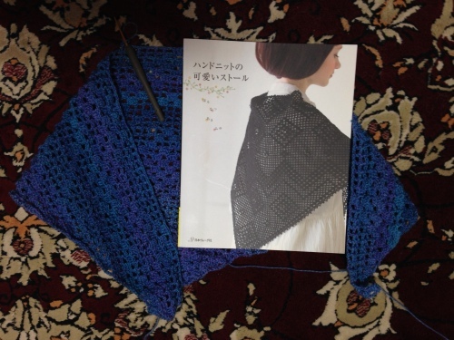 旅行に行くにあたり、やはり何か編み物を持って行きたくて、かぎ針編みのショールを編むことにしました。日本ヴォーグ社の「ハンドニットの可愛いストール」の表紙のショールです。ハンドニットの可愛いストール【バーゲンブック・生活実用】使用糸は先日巻き直しをした「ユウヤケのソラ」103番の青系。夕焼けをイメージしたグラデーションカラー【G622】ユウヤケのソラ[毛100% 中細 90g~100gカセ(約390m) 全8色]毛糸 ピエロ♪編み物/手編み/手芸間違えたり、編み地が気に入らなくて3回ほど全ほどきしました。やっとここまで編んだところです。 で、今回 機内にかぎ針を持ち込んでみました。結果、大丈夫でした。普通に持ち込めて普通に編物できました。以前、もしかしたら取り上げられたり、注意されるかもと聞き、諦めたのですが、今回やってみたら意外と平気だったというわけです。今回はかぎ針だったからかもしれませんし、時期やそのときのスタッフの方によっても違うかもしれませんので、絶対大丈夫とは言えませんが、大丈夫な時もあるというのは確かです。