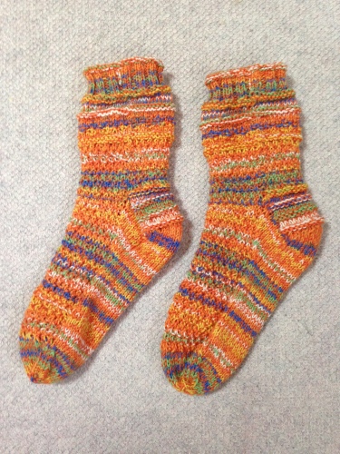 3足目の靴下を編み始めました。「ハンドニットのソックス」日本ヴォーグ社のC、michiyoさんデザインの靴下です。http://www.amazon.co.jp/%E3%83%8F%E3%83%B3%E3%83%89%E3%83%8B%E3%83%83%E3%83%88%E3%81%AE%E3%82%BD%E3%83%83%E3%82%AF%E3%82%B9-Lets-knit-series/dp/4529048977/ref=sr_1_1?s=books&ie=UTF8&qid=1450035206&sr=1-1&keywords=%E3%83%8F%E3%83%B3%E3%83%89%E3%83%8B%E3%83%83%E3%83%88%E3%81%AE%E3%82%BD%E3%83%83%E3%82%AF%E3%82%B9この本、悪い評価も多いんですよね。確かにちょっとわかりにくい説明かもしれませんが、デザインはかわいいんですけどね。ただこれ1冊で初めての靴下を編むというと・・・嶋田俊之さんの「手編みのソックス」先に買っとけと思います。【楽天ブックスならいつでも送料無料】手編みのソックス [ 嶋田俊之 ]この本は解説もわかりやすかったし、基本のソックスからおしゃれソックスまであって。正直これ1冊あれば一生靴下編むのに困らないかも。使いすぎてぼろぼろなので、もう1冊買っておこうかと思うくらい。 「ハンドニットのソックス」の方はすでに手に入りにくいのでいまさら書評しても・・・でしたね。 さて、今回の靴下も在庫のカメレオンカメラ使用。イタリア直輸入!\アンコールGOGO!!/【677】Chameleon Camera(カメレオン カメラ)[毛(防縮ウール)75%ナイロン25% 合細 95~100g玉巻(約420m) 全17色]毛糸ピエロ♪編み物/手編み/手芸☆イタリア直輸入のソックヤーン 毛糸 手編み 編み物★ChameleonCamera(カメレオンカメラ)合細 輸入糸【1玉単位 】Z723【毛糸ZAKKAストアーズ♪】 毛糸 手編み 編み物今回は05番のレトロボーダーと純毛中細糸のオレンジを引き揃えて使ってます。ハマナカ ピエールファミリーシリーズの純毛中細毛糸です。とってもリーズナブルな純毛毛糸です。ゆうパケット発送は不可です。ハマナカ ピエールファミリー ウールM今かかとを編んでます。ちょっと派手派手なソックスになりそうです。