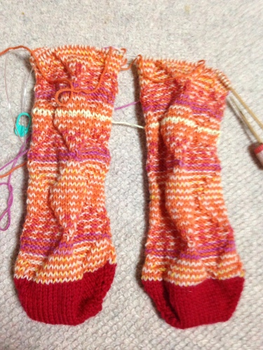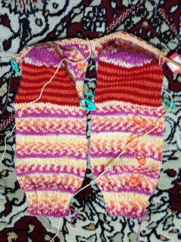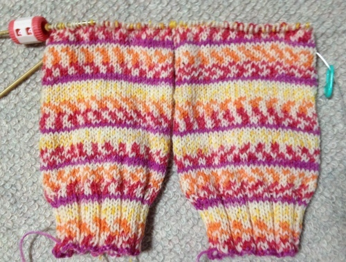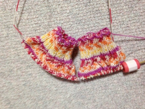 ここまで編んでかかとを編み始めましたが、なぜかうまくいかない(´・_・`)目数が合わなくなってしまって、3度ほどきました。次はうまくいきますように。今編んでいる靴下はかかととつまさきがしましまになります。