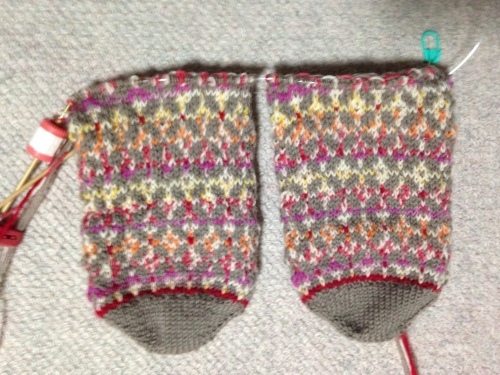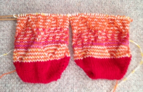 「ハンドニットのソックス」からGのソックスを編み始めました。岡まりこさんデザインです。本当は履き口から編むパターンですが、前回の復習も兼ねてトゥアップで編み始めました。林ことみさんの「手編み靴下研究所」で紹介されていた方法です。【楽天ブックスならいつでも送料無料】手編み靴下研究所 [ 林ことみ ]編み図の通りですが、ラベリーで見た他の方がつま先とインステップの間にアクセントカラーを編んでいてそれが素敵だったのでほどいて編み直ししました。やっぱりこの方がかわいい。使用糸は段染めがカメレオンカメラの1番トロピカル赤とグレー?がスリークォーターです。 編み込みの糸が渡るので厚手のソックスになります。渡糸に指がひっかかりそうだから人にはあげないで自分で履こうかな。