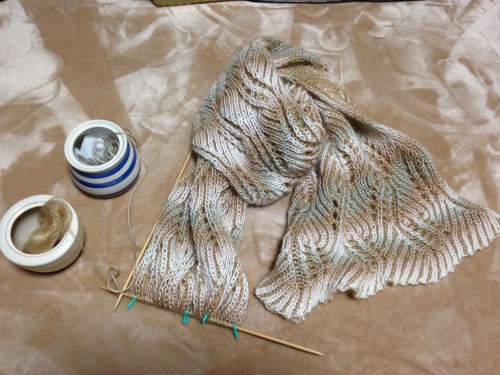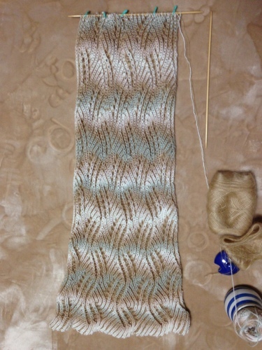 先日編み上げたセーターの水通しが終わり、着画んっ!丈が短い?着られないことはないけれど、やっぱりこれは厳しい。急遽修正することに、ゴム編み部分をとって、裾から目を拾い、残り糸で編み足しをすることにします。 さて、そうするとスカイツリーマフラーの糸が足りなくなります。似たような糸を探して編み続けようか?それともほどくべきか?今ここまで編んでます。実は、グレイの残量が不安だったので、最初はグレイの2本取りで編んでいて、途中で「スリークォーター」の薄茶に1本を変更しています。たぶん変更したのが、下から4、5模様目なのですが、色は違う糸なのにわりと馴染んで、編んだ本人もよくわからないくらい。なので、このままグレイが終わったら「スリークォーター」で編んじゃうかも(๑≧౪≦)