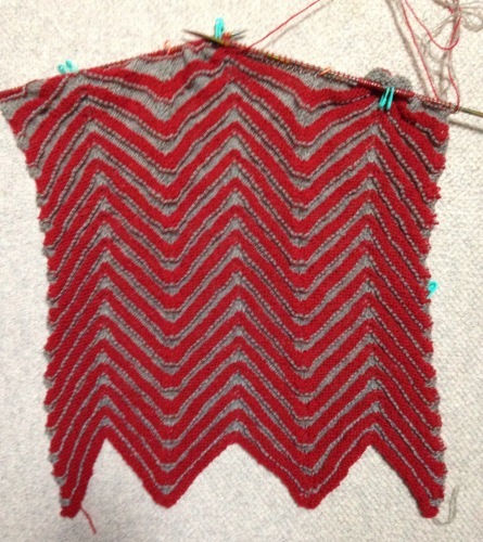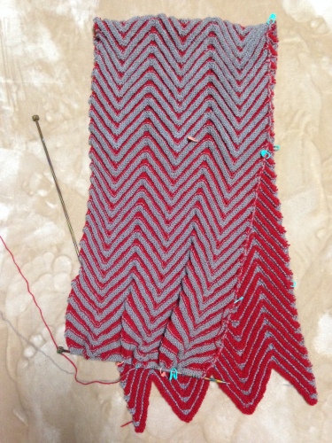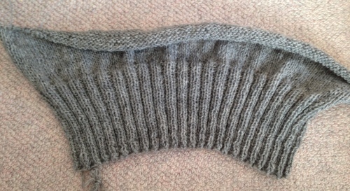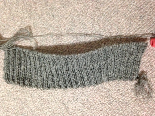 ゴム編みが終わり、メリヤス編み部分に入りました。これからえんえんとメリヤス編み砂漠です。なにしろ、糸がギリギリ。今回は配色だけが変化となります。でも、編み地はなんだか雰囲気があって好き(*゚▽゚*) 写真を撮り忘れましたが、あまり進んでません。