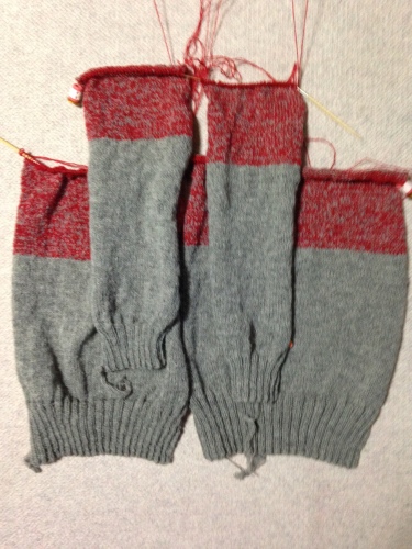 Isagerの糸で編む、シンプルなメリヤス編みのセーターメリヤス部分を20段ほど編みました。少しずつ編んでいきます。 さて、今回なかなか進まないのはなぜか。実は身ごろ2枚と袖2枚をいっぺんに編んでいるからです。というのも、今回は配色をするので、同じところで色を変えたい、そして、糸量に余裕がないからです。このグレイの糸を2本どりで編んで、3分の2の量、200g分編みます。次に残りの100g分を赤と合わせて編みます。グレイが終わったところで赤の2本取りにする。と、いう予定です。これで編んで配色のバランスがうまくいくのか?そこは不安ですが、なんとかなることを祈りつつ・・・がんばります。