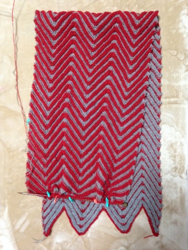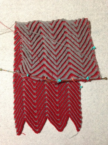 ここまで編んだのですが、オレンジのマーカーから先、やはりグレーの糸の部分が貧弱に感じます。16模様ほどほどいて編み直すことにしました。完成はまた先延ばしになりました。