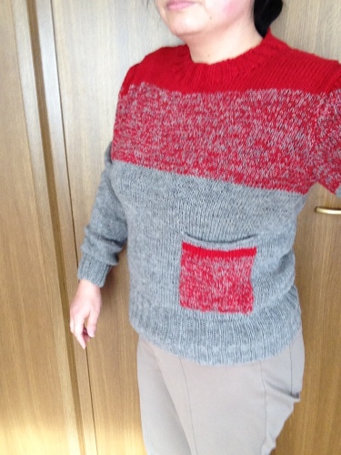 去年、「ニッティングデイズ in清里」で買った糸、「Isager」の「Tvinni」の赤と「Spinni Tweed」のグレイ各3かせ300gを使い編んでいたセーター編みあがりました。ついでにスワッチをポケットにしてみました。 使用量はグレイ225g。赤は50g。玉でいえば、4玉半と1玉ですね。思ったより残りました。残り糸でまだ何か編めそうです。何編もうかな?毛糸家計簿2016日付朝の在庫消費累計消費購入累計購入夜の在庫新作累計作品 2016/2/15800544025795111Isager今日の購入編物費合計023,499