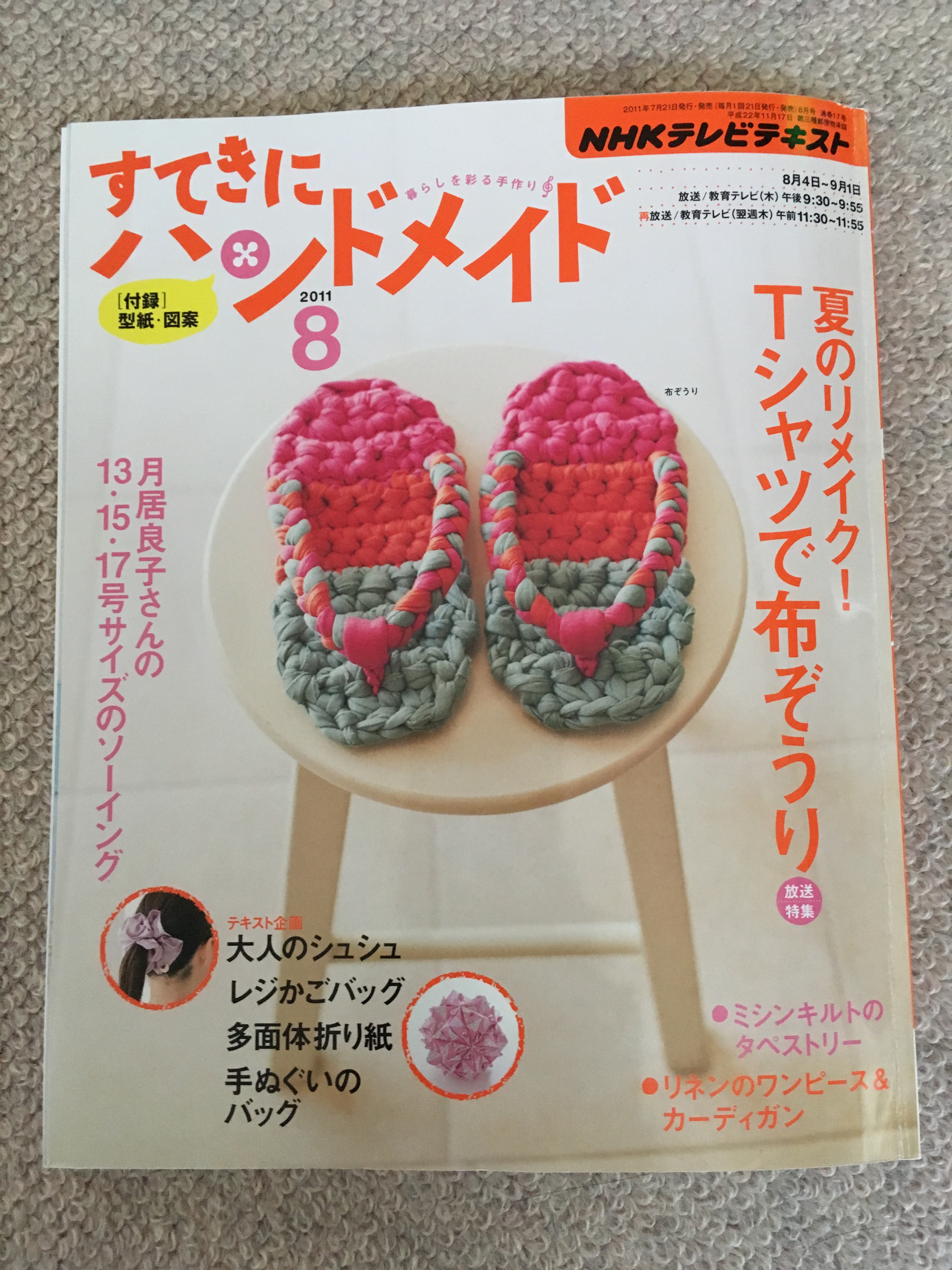 昨日、大失敗した布ぞうり。あの書き方だと、作品の素敵さが伝わらないと反省。ちなみに、ちゃんと作ればこんなふうに。「すてきにハンドメイド」2011年8月号ほら素敵。私の作ったのがへただっただけなのですよ。で、布ぞうりリベンジ今度はわらじを編むように作ってみることにしました。You tubeの動画を見ながら格闘すること半日。左が2回目 右は3回目少しずつ上達しているものの、まだまだ履けるものにはなりません。布ぞうり・・・初心者はシーツみたいな布の方がいいとか。しばらく休んで、またいつかリベンジするつもりです。が、今回は一旦退却します。大惨敗(T^T)