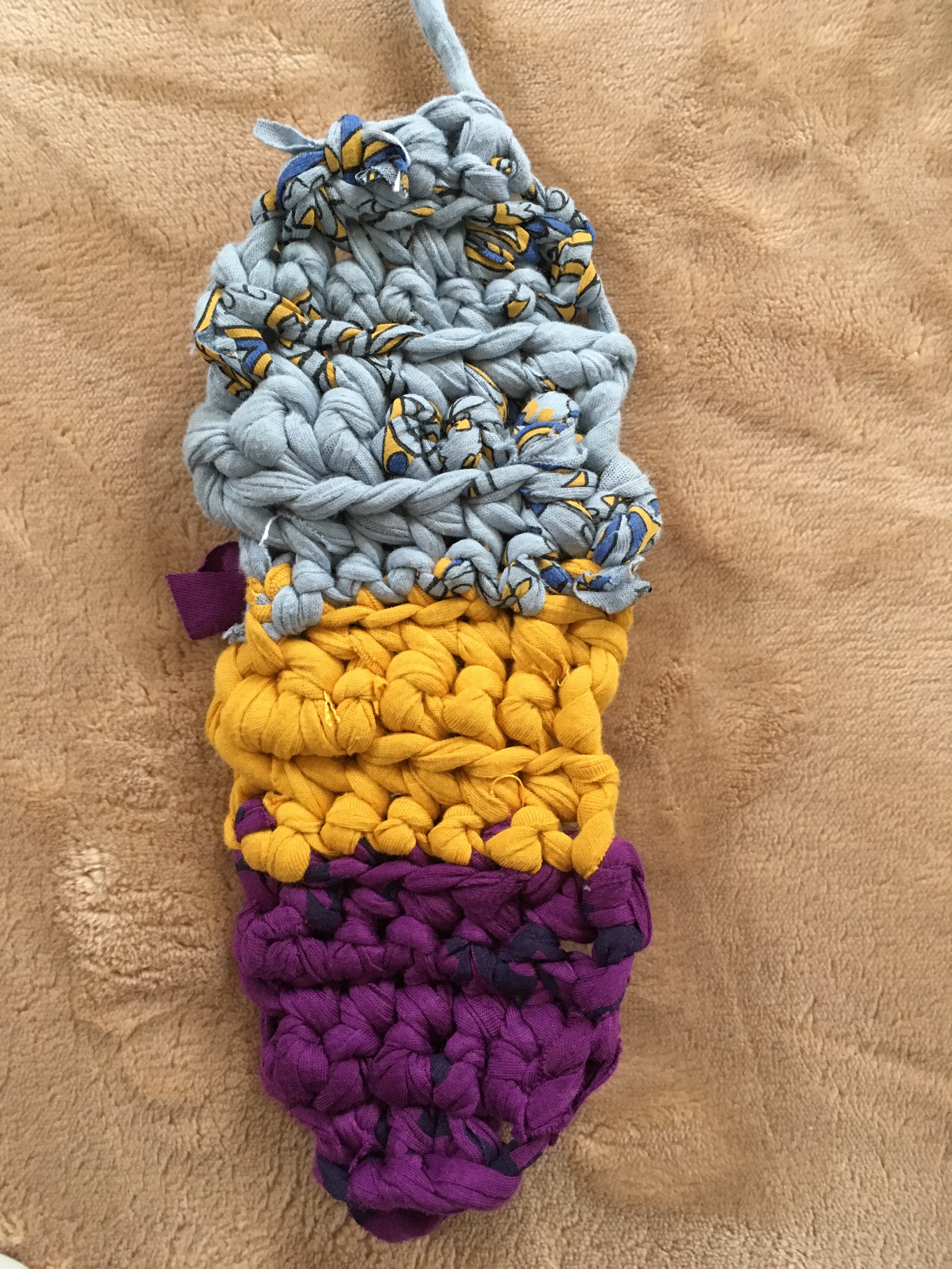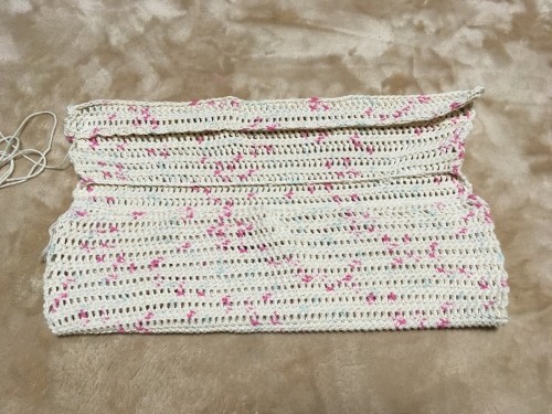 ここまでで2玉消費。あと少しで脇まで編めます。そして、前回縫った小物入れ今回、端のリボン縫い付けなくてもいい方法を思いつきました。次は型紙を作って同じサイズで作れるようにしようと思います。