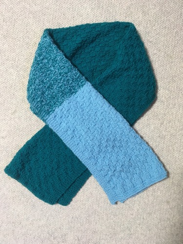 恐ろしい食欲に襲われ、「これくらいなら・・・」を繰り返し。3週間。とうとう体重が増え始めました(;_;)さすがに反省。明日からまた引き締める!今日の体重65.2kg先週より+1.4kgさて、ボランティアニットのマフラーが編みあがりました。 スリークォーター2本取りです。緑を4玉を少し。水色を2玉使用。子供用にしては幅が広かったかな。もう少し細くて短い方が使いかってがいいかも。これだけでは少ないので〆切までにもう少し編みたいですね。毛糸の消費6玉今年の消費111玉今年の購入75玉在庫は778玉になりました。