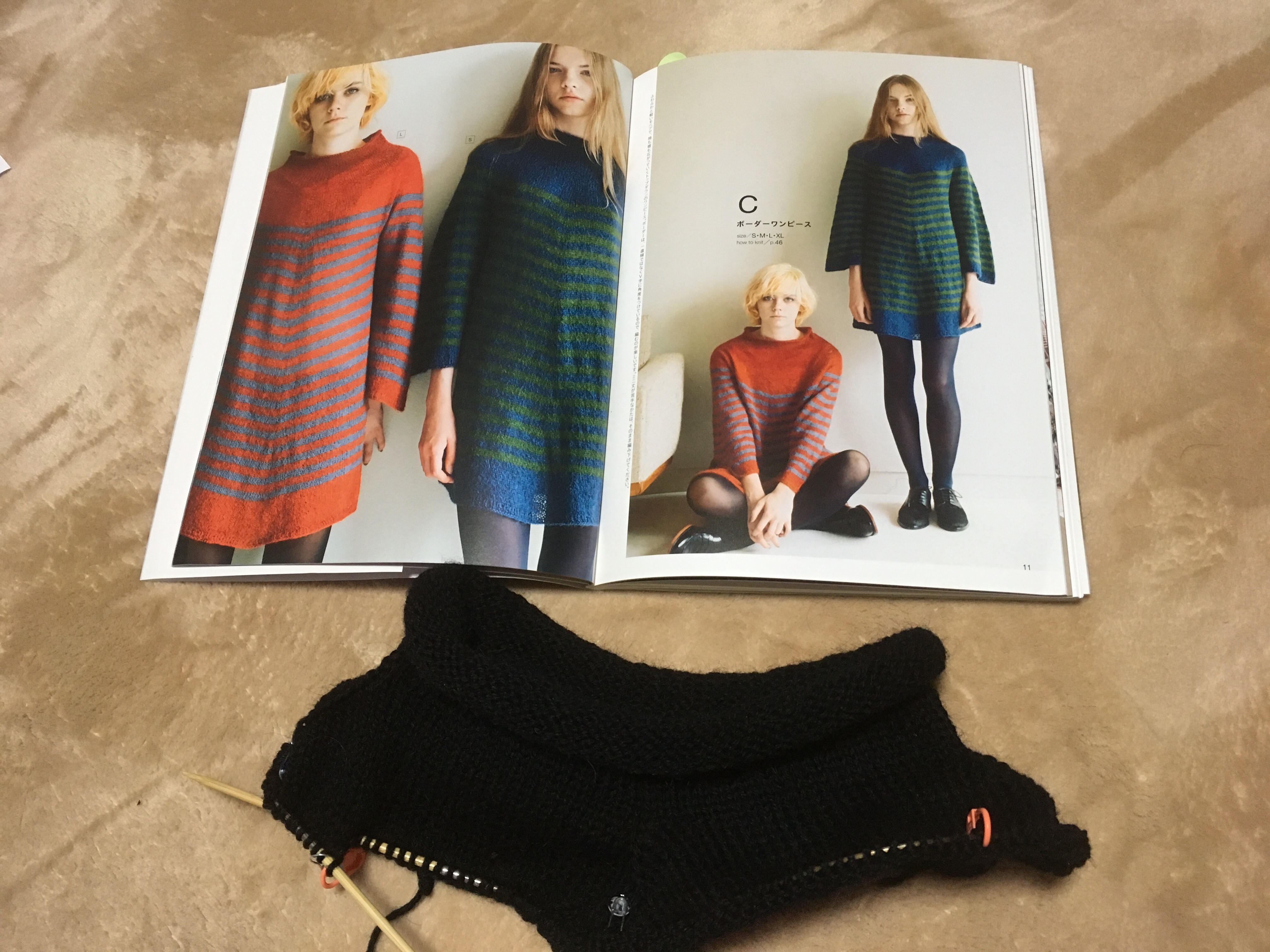 ベストに続き、編むのはこちら。S・M・L・XL KNIT サイズの選べる手編みの本 [ michiyo ]この本から、ボーダーワンピース。トップダウンなので、襟から編み始めて今はヨークの増し目をしているところ。ヨークが編めたら、次はボーダー部分に入ります。使用糸は前回と同じアルパカウール。黒。配色はピエロさんのベーシックアルパカ。ライトブラウン。どちらも廃番?みたいです。検索してもでてきません。さあ、がんばって編もうっと。