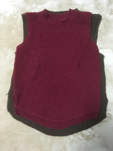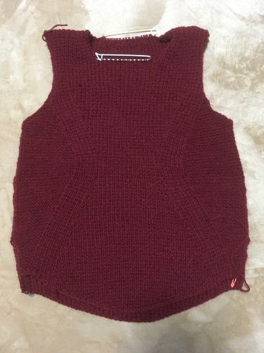 michiyoさんのベスト、2枚目は前後差をつけてみました。こんなかんじ。脇にゴム編みもはいってます。
